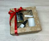 Kosmetyki zapakowane w kartonik z tektury, otoczone wełną drzewną i przewiązane ozdobna wstążką.