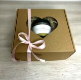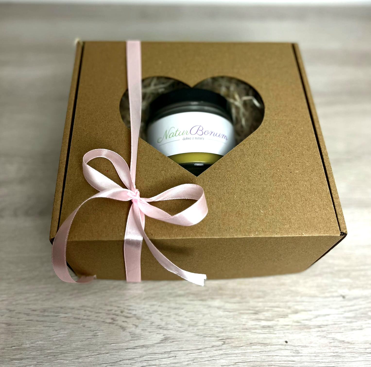 Kosmetyki zapakowane w kartonik z tektury, otoczone wełną drzewną i przewiązane ozdobna wstążką.