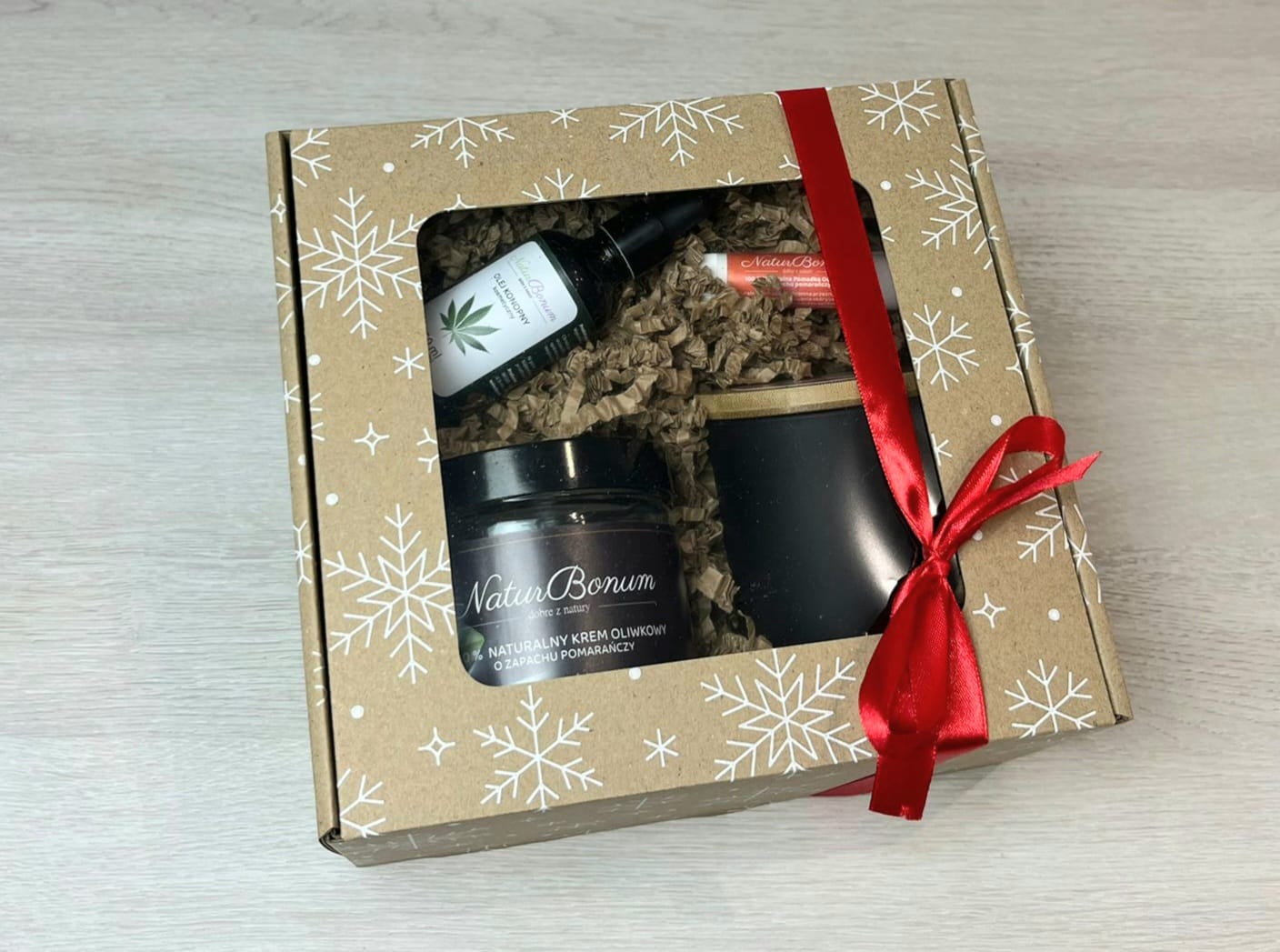 Kosmetyki zapakowane w kartonik z tektury, otoczone wełną drzewną i przewiązane papierowym sznurkiem w kolorach NaturBonum. Do każdego zestawu dołączony jest bilecik, który możemy spersonalizować zgodnie z podanym tekstem podczas zakupu.