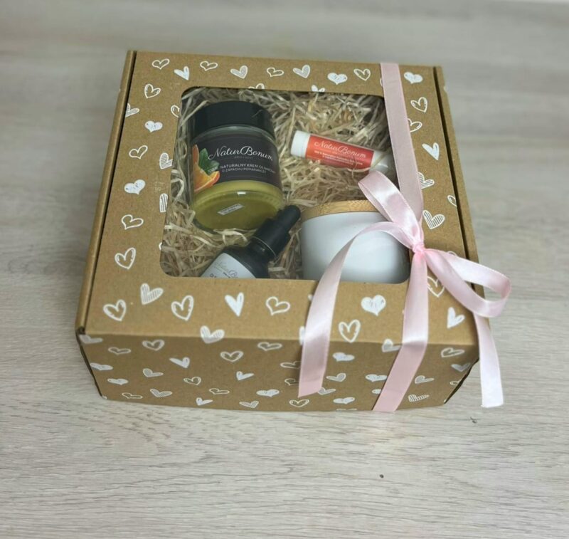 Kosmetyki zapakowane w kartonik z tektury, otoczone wełną drzewną i przewiązane papierowym sznurkiem w kolorach NaturBonum. Do każdego zestawu dołączony jest bilecik, który możemy spersonalizować zgodnie z podanym tekstem podczas zakupu.